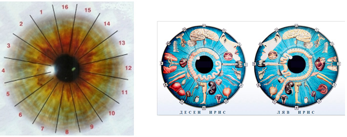В ириса има кръгови деления, местоположение на всеки орган, телесна конструкция, делене по области, цвят, плътност, релеф.